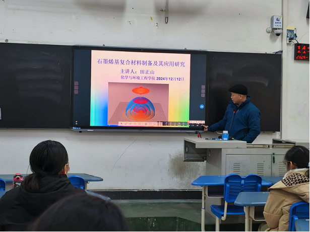 12月12日下午,金沙威尼斯欢乐娱人城田正山博士在4101教室为金沙威尼斯官网2024级化学1班同学作《石墨烯基复合材料制备及其应用研究》的学术报告。