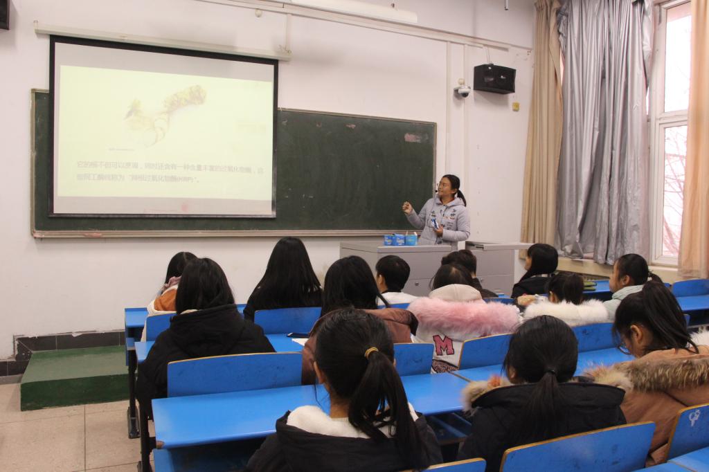 随后,张立会博士进行了以“血红素仿生辣根过氧化氢酶的制备及活性检测”为主题的报告。张立会博士提到,酶的环保性使其成为解决工业水污染问题的最佳方案。清晰的图文展示吸引着同学们认真听讲,并积极做笔记。报告会结束,同学们用热烈的掌声感谢罗晓强博士和张立会博士进行本次学术报告。