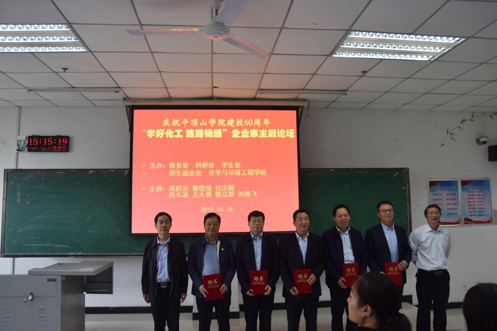 活动开始前,中国平煤神马集团焦化事业部部长、中国平煤神马平顶山朝川焦化有限公司党委书记、94级校友韩群亮,中国平煤神马集团首山化工有限公司党委书记、董事长、90级校友曹德彧,河南神马氯碱化工股份有限公司总经理、89级校友付汉卿,中国平煤神马集团汝州电化有限公司董事长、89级校友田长波,河南平煤神马远东化工有限公司总经理、93级校友王大勇应学校之邀,受聘为我校行业教师。
