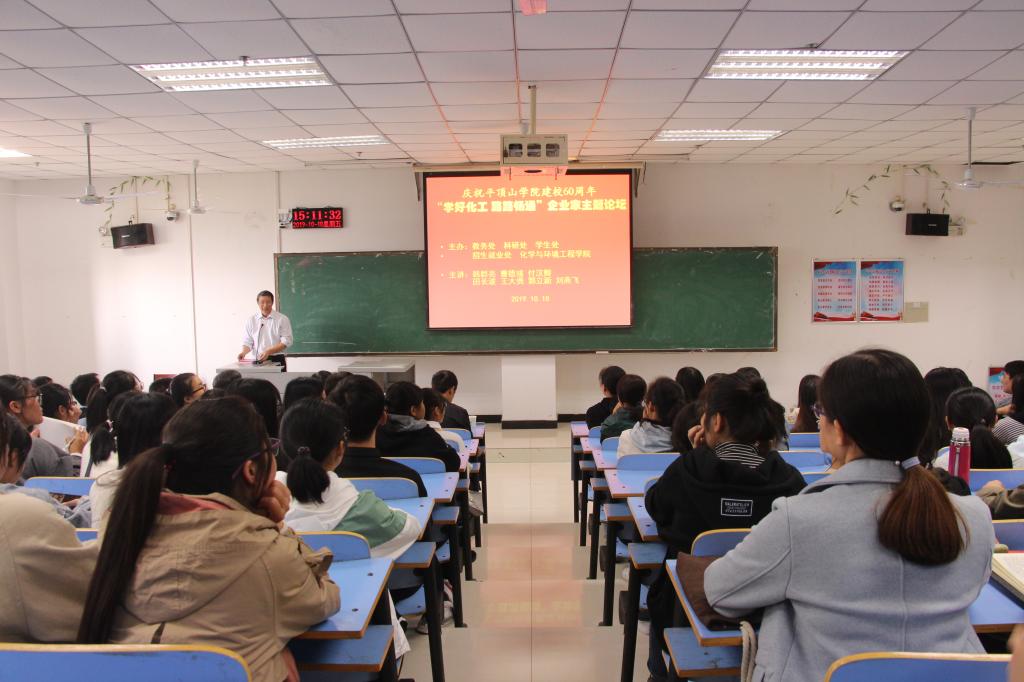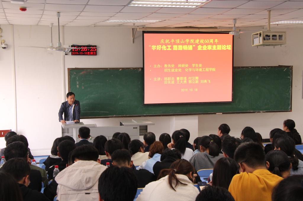为庆祝金沙威尼斯欢乐娱人城建校60周年,由教务处、科研处、学生处、招生就业处、金沙威尼斯欢乐娱人城共同主办的“学好化工 前路畅通”企业家主题论坛于10月18日下午在图书馆411教室举行。下午三点,活动正式开始,教室内座无虚席,过道、窗外听众爆满,来自化学工程与工艺、材料科学与工程等专业的200多名师生参加了活动。