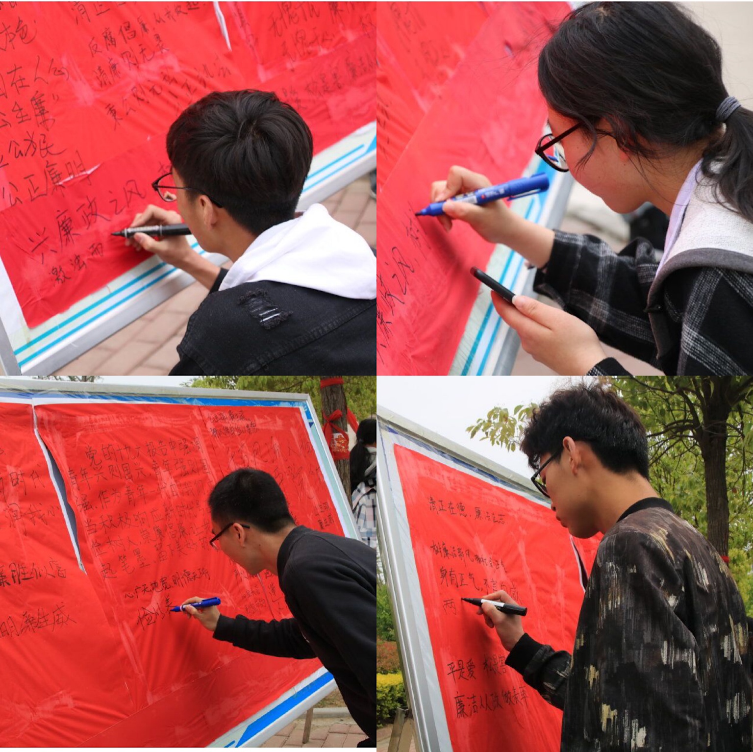 4月25日进行的廉洁宣言签名活动,同学们积极参加并有序留言,“清正在德,廉洁在志”、“两袖清风,公正廉明”、“反腐倡廉,从我做起”一句句留言的书写,不仅仅是一份庄严的承诺,更是一份沉甸甸的责任,反映出了我校大学生廉洁自律的优良品质。