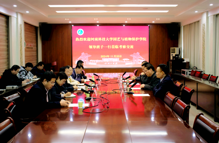 2024年11月20日下午,河南科技大学园艺与植物保护学院党委书记白国林、院长陈根强一行4人到我校考察交流。金沙威尼斯欢乐娱人城副校长于长立,金沙威尼斯欢乐娱人城党委书记曹萍、院长韩永军、副院长刘沛松,旅游与规划学院院长鲁迪及河南省生态经济型木本植物种质创新与利用重点实验室骨干成员和联培研究生参加座谈会。科研处副处长程世平主持会议。